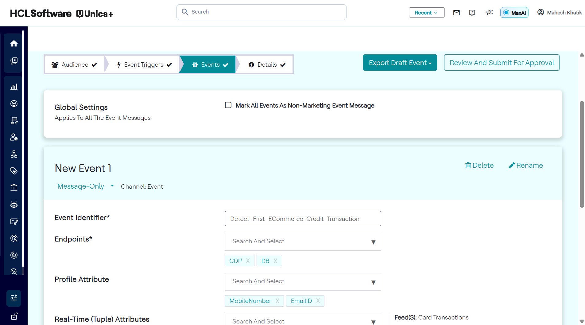 Set an event to be given to the qualified customers, as seen in the image below. Fill up the Event ID to correspond with events configured in the downstream system. Downstream systems can be selected as CDP, Interact or Journey (for real-time events) or DB (for batch events). Lastly, profile & real-time attributes can be selected based on the event & offer.