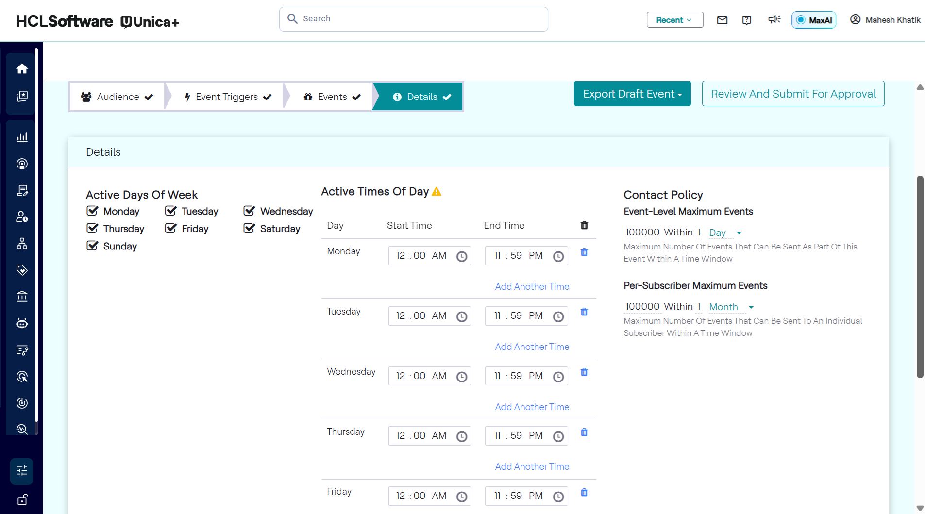 Set the details of the event, as seen in the image below. This event can be scheduled to detect triggers on all days, with a time (or times) for each day specified. Maximum events for a specific customer within a time frame and total customers within a time frame can be selected here as well. Click Save and Continue to Review to proceed.