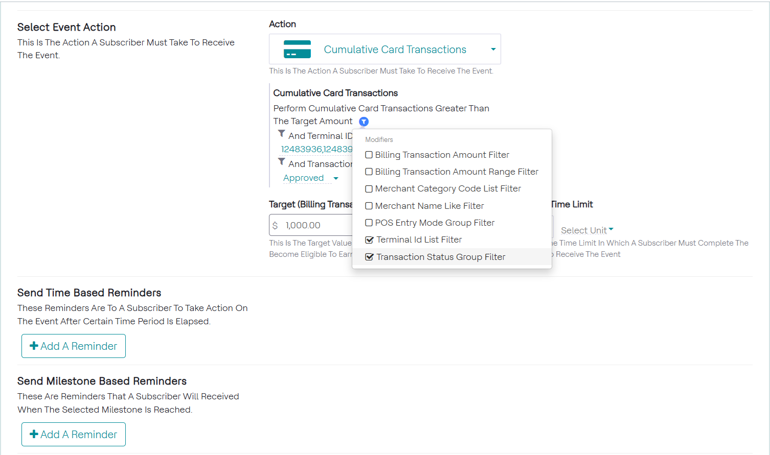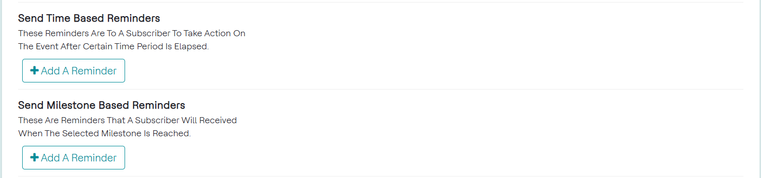 For Action-Based Events, the customer must complete an action to receive the product of an event. Time-based & Milestone-based reminders can be added as well.