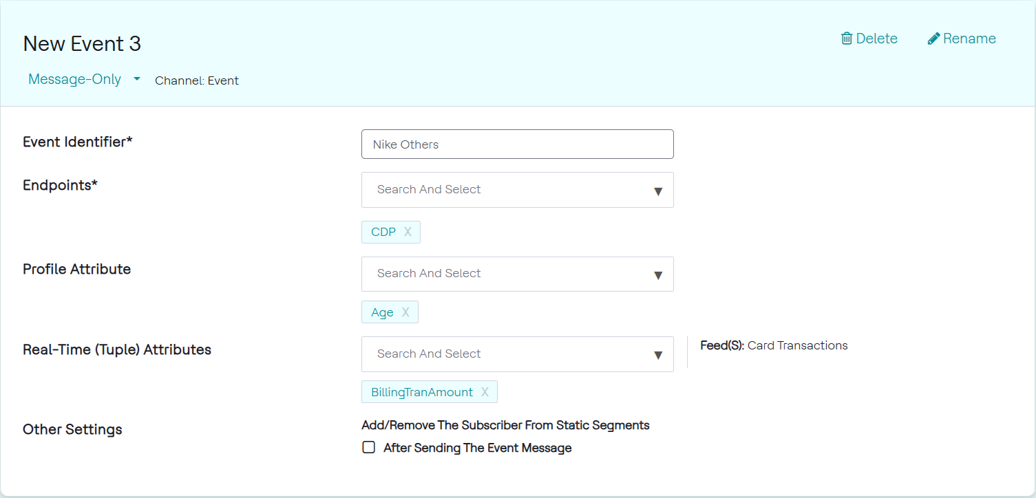There are two event types to choose from: Message-Only & Action-Based. Both events require an Event ID and Endpoint to be selected. Additionally, the UI allows attributes from each data source to be selected which is forwarded to the chosen endpoint. For all events, we suggest selecting customer first/last name, email ID, phone number, and all relevant channel information (push note, email and text message) with their preference flags from the customer profile with customer ID (custID) and transaction date time (sysDateTime) from real-time attributes.