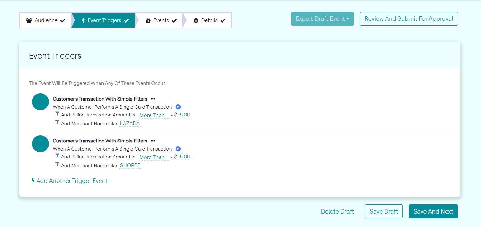 An event can have more than one trigger condition. If more than one trigger is used, a customer can satisfy at least one to be qualified. This is similar to the Any of the following condition group.