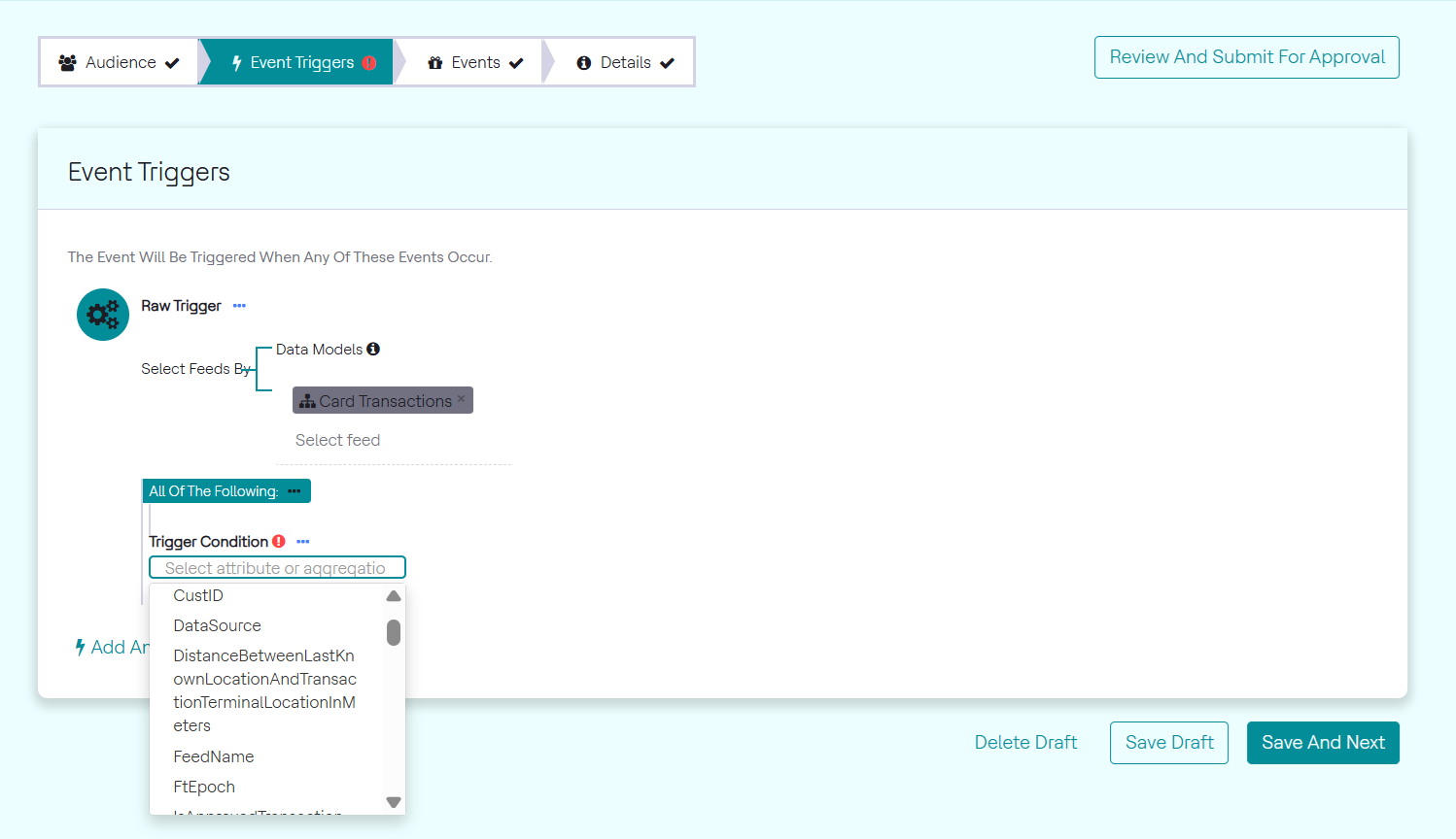 3. Select an attribute/aggregation to filter by. Clicking on Select feed will display the list of feed names to choose from, as seen in the image below. Each of these feeds contain sets of related attributes and aggregations. Select Feed Name as Transaction Based Triggers which represents the real-time credit card feed.