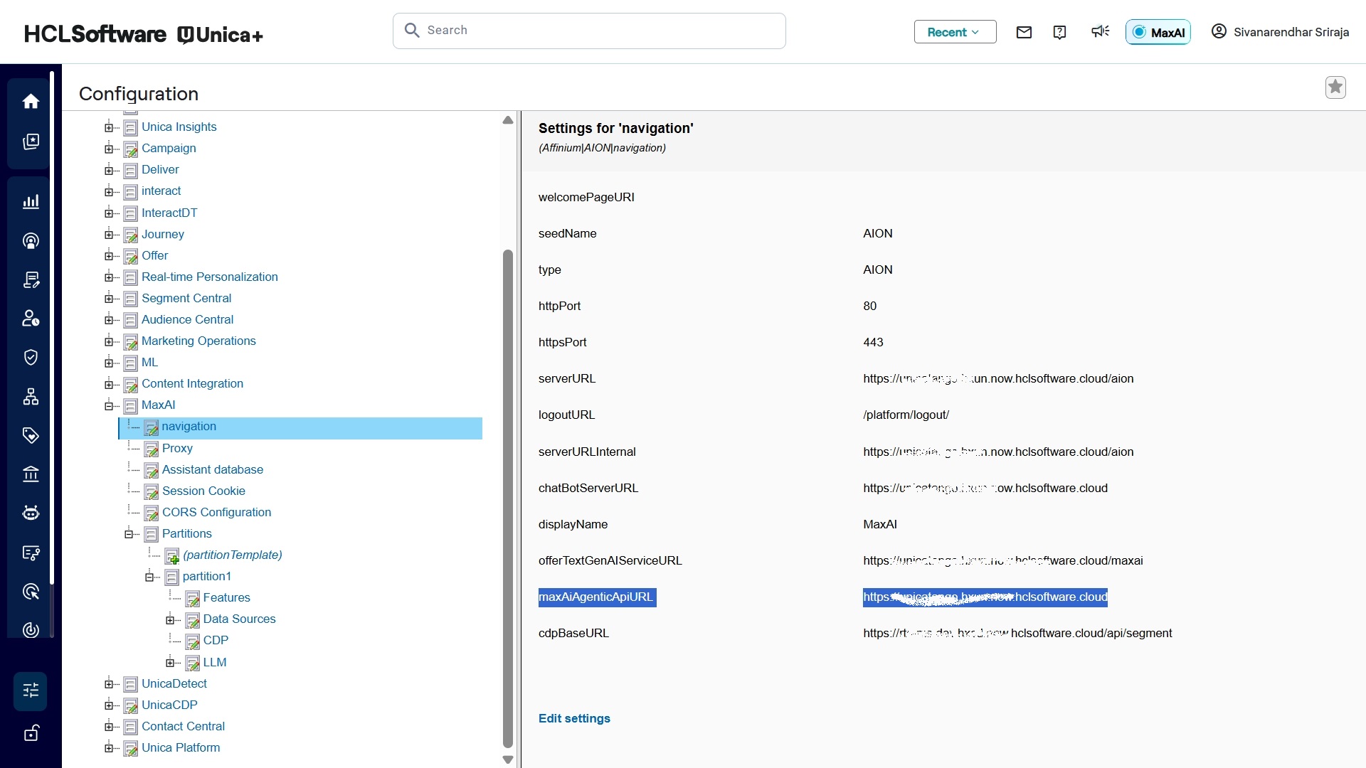 "corsConfig": { "allowedHeaders": [ "" ], "allowedOrigins": [ "<https://platform-domain-url>", "https://developer:8443", “” ] },"maxAiConfiguration": { "maxAiAgenticApiURL": "<https://platform-domain-url>" },Note: If you have a MaxAI license, enable this configuration to use MaxAI.Note: The maxAiAgenticApiURL must be configured in the Platform Configuration as shown below.
