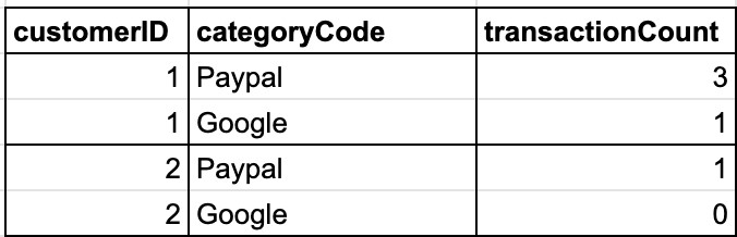 The expanded table in the image below contains information about the number of card transactions by customers for the last 1 month. CustomerID 1 and customerID 2 from the table above can be found also. CustomerID 3 with a Google transaction and CustomerID 4 with both Paypal and Google transactions are also included in the table.
