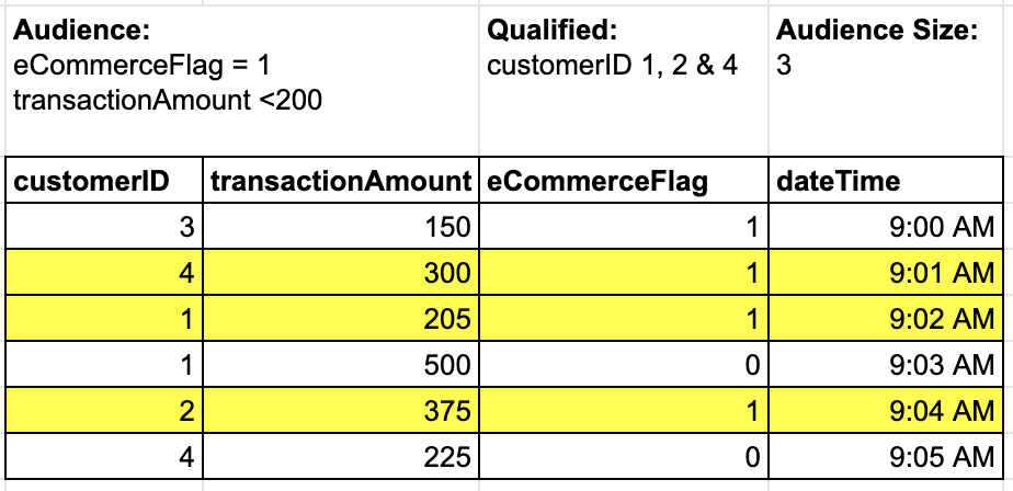 At this point, customerID 2, customer ID 3 and customer ID 4 satisfy the audience conditions. The audience size is shown as 3.