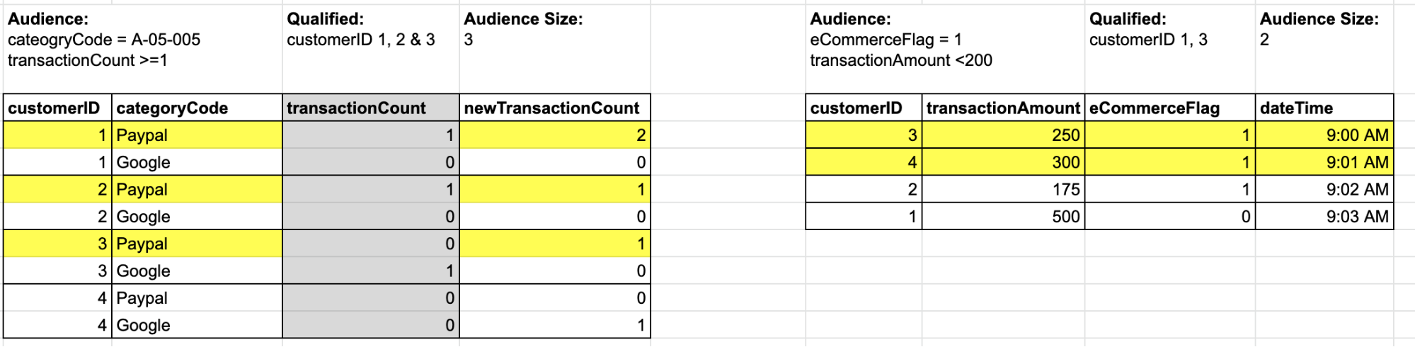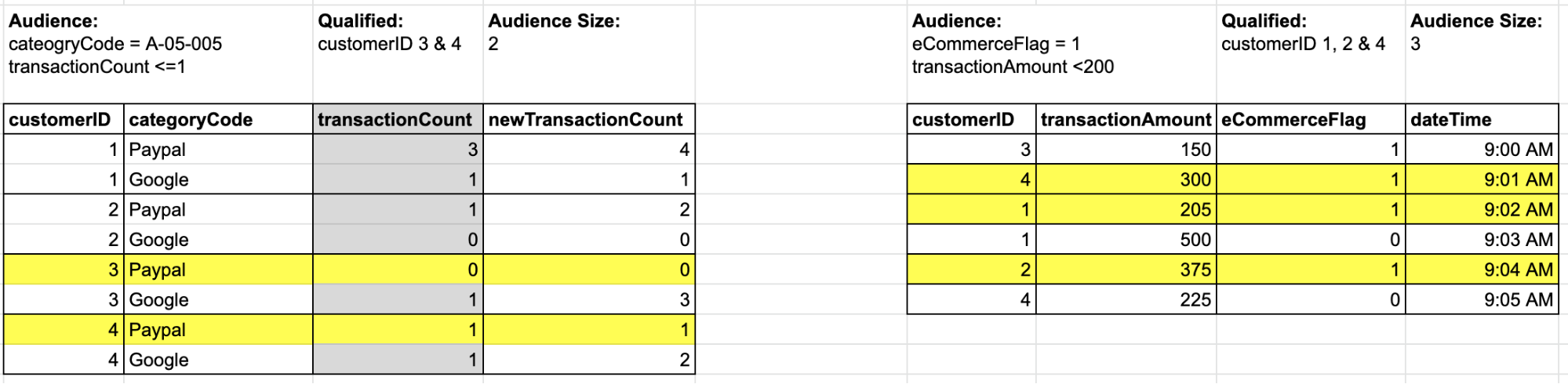 It is important to note that this audience condition computes the combined transaction count of both Paypal and Google, even if the both the categories have not been fulfilled. For example, customerID 2 has a Paypal transaction count of 2 and the Google transaction count of 0. The combined transaction count will therefore be 2 + 0 or 2, and he will qualify for the audience.