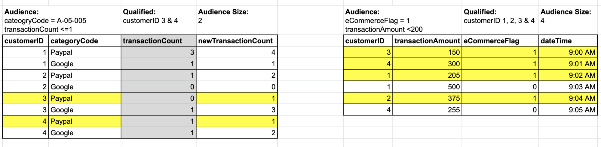 A representation of these audience conditions and the way customers are qualified is shown in the image below. The customers who initially satisfy these conditions are highlighted in yellow in the table and make up the audience size. It is important to note that the audience size changes constantly. This is because as time passes, customers are added to or removed from the event based on if they can meet the audience conditions. If customer 4, who currently meets audience conditions, transactions with Paypal once more in the same month, they will not meet the condition and will be removed from the audience. Similarly, customer 3 will continue to meet conditions for their next 2 Paypal transactions only.