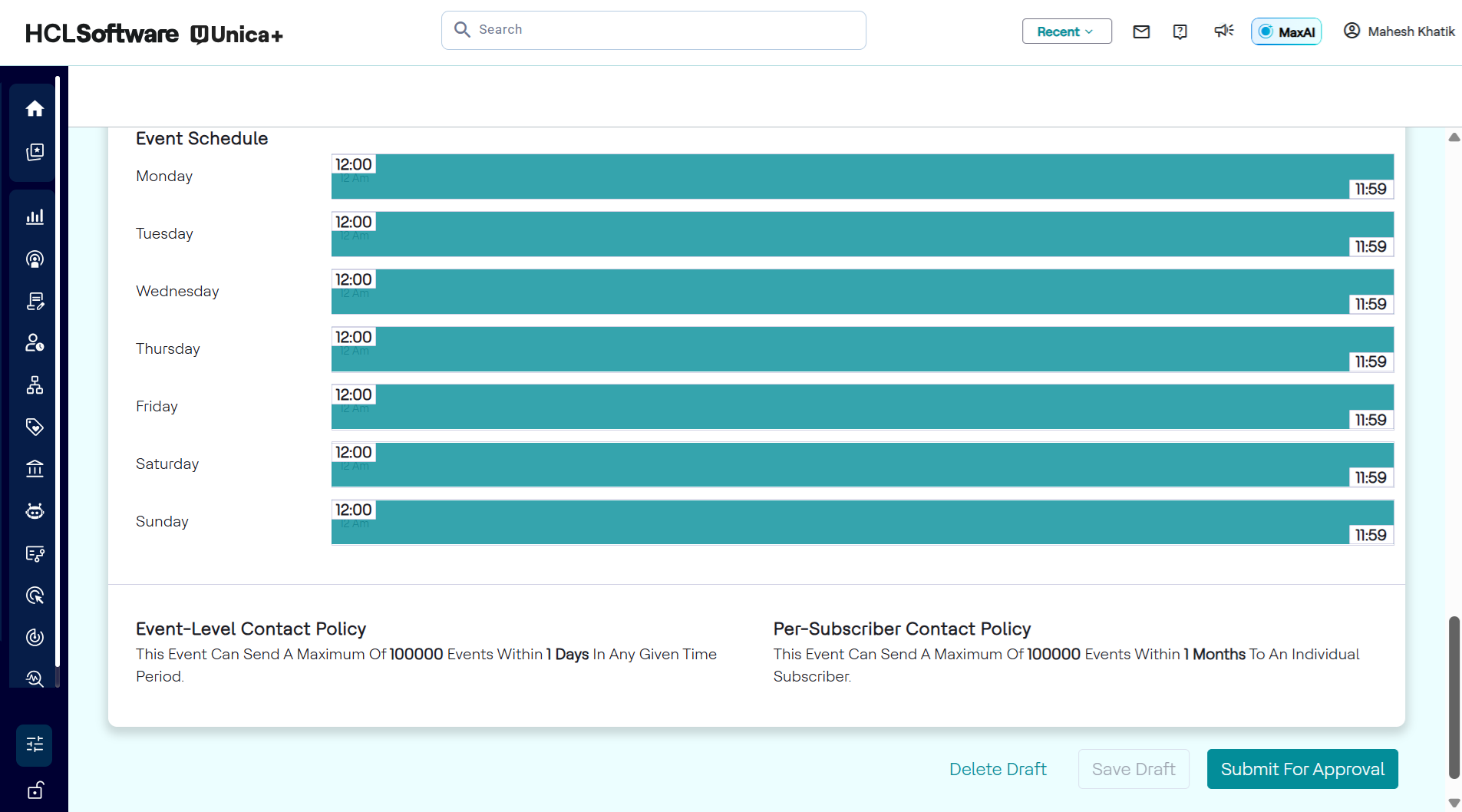 - Event status updates to Declined, allowing maker to revise and resubmit. Example: A checker reviews a draft for a "Referral bonus campaign," updates the start date, and deploys it. If declined, feedback is shared with the maker for correction.