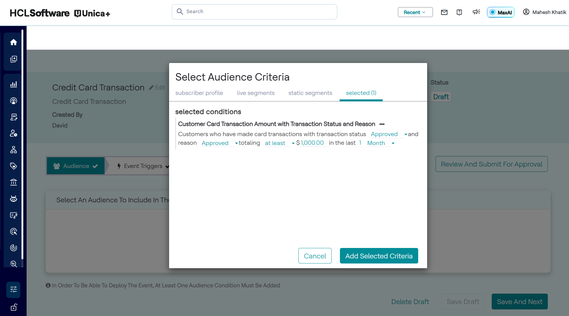 Set the audience conditions, as seen in the image below. These conditions determine the customers to target during the event.