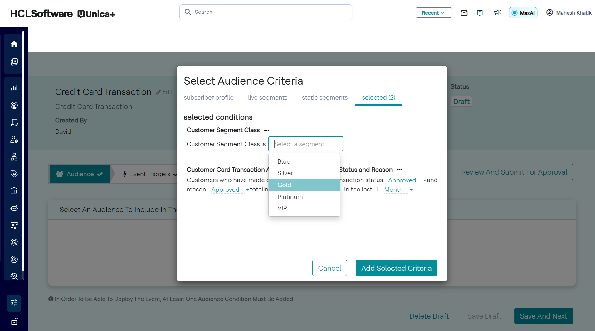 A condition can also be edited on this tab, as seen in the image below. In the figure below, Customer Status has valid options that can be selected. Another example is in the inactivity condition, where more or less can be selected and the time period can be changed. Once editing is complete, click Add Selected Criteria to proceed.
