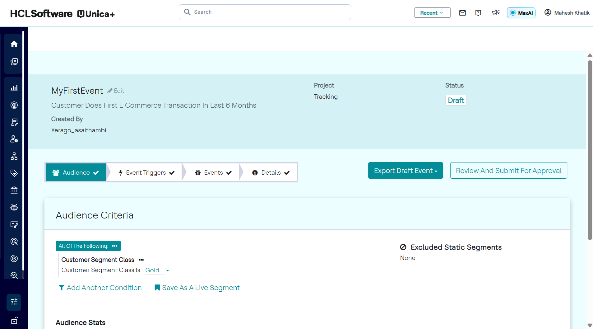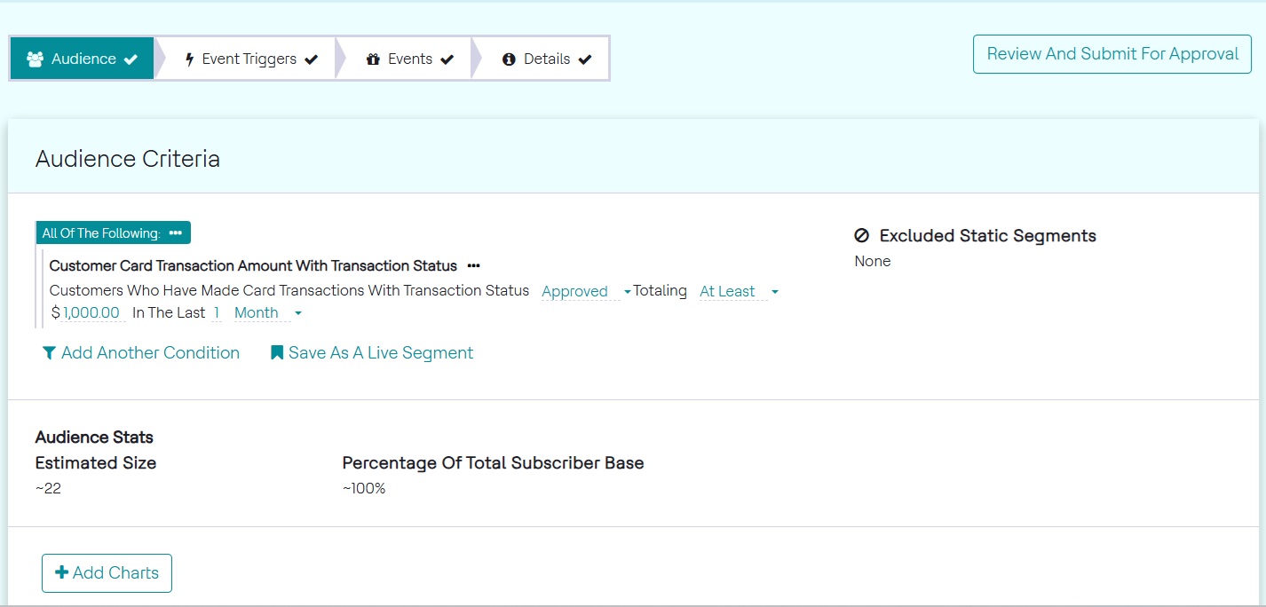 After proceeding from Details, a page will be displayed where the Audience, Triggers, Events and Details of the event can be reviewed. The images below show this.