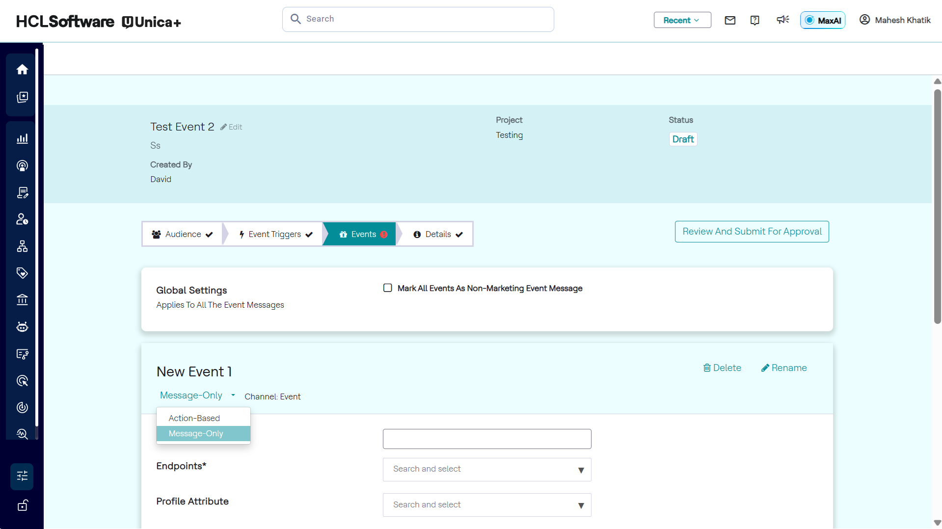 Once the event is edited and reviewed, Submit for Approval. This will usually be done from a Makers account. The image below shows the status once submitted, from a Checkers account. This will allow a Checker (or Admin) to review the event.