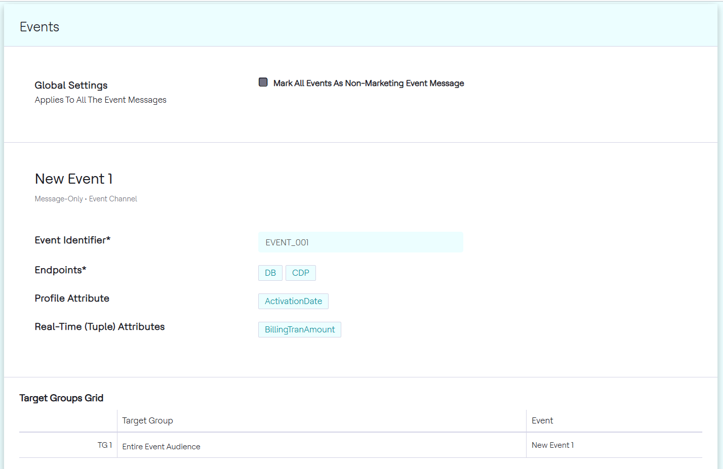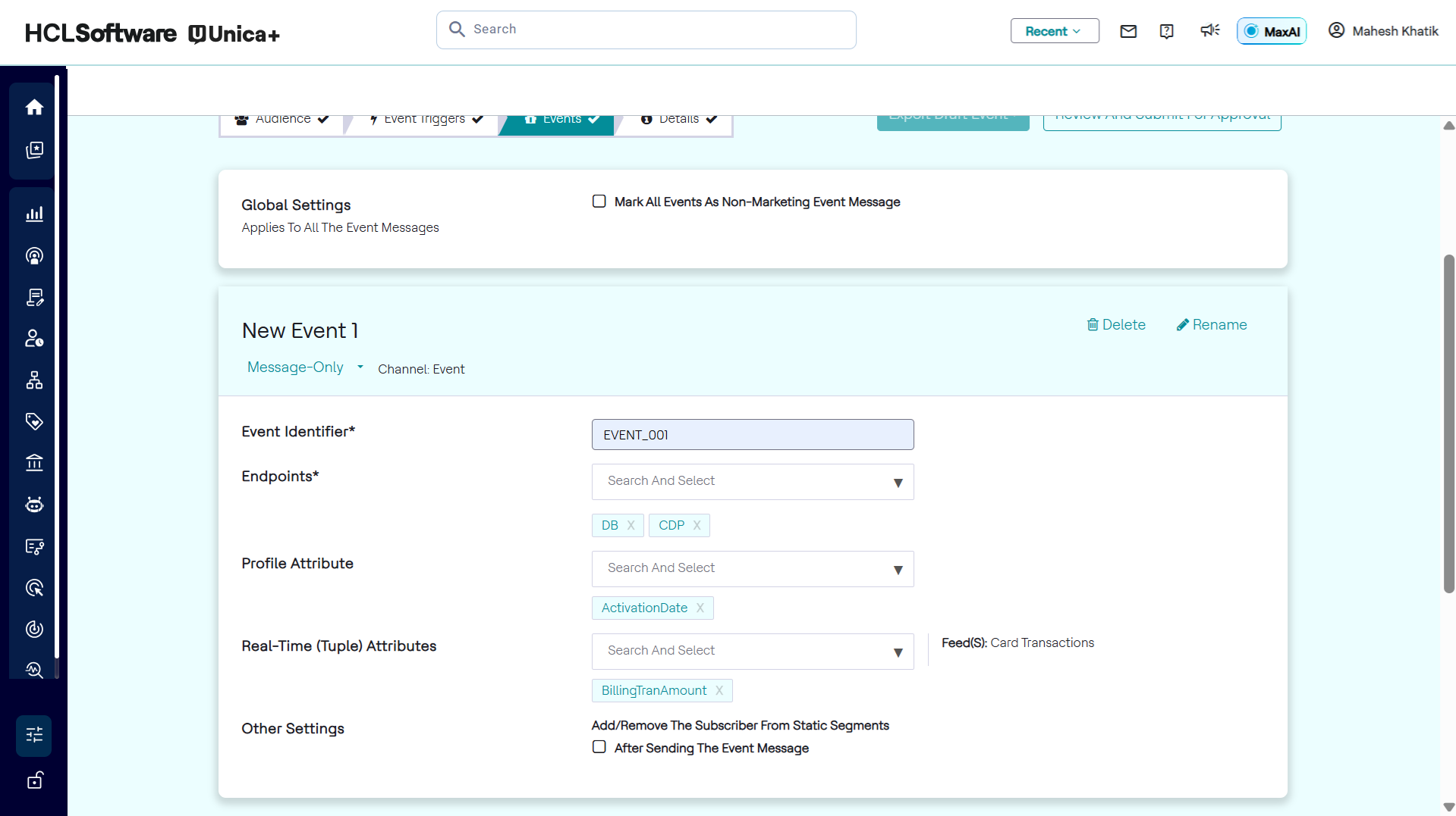 Set an event to be given to the qualified customers, as seen in the image below. Fill up the Event ID to correspond with events configured in the downstream system. Downstream systems can be selected as CDP, Interact or Journey (for real-time events) or DB (for batch events). Lastly, profile & real-time attributes can be selected based on the event & offer.