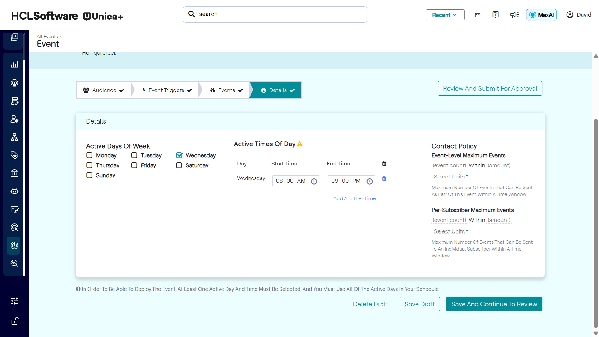 Set the details of the event, as seen in the image below. This event can be scheduled to detect triggers on all days, with a time (or times) for each day specified. Maximum events for a specific customer within a time frame and total customers within a time frame can be selected here as well. Click Save and Continue to Review to proceed.