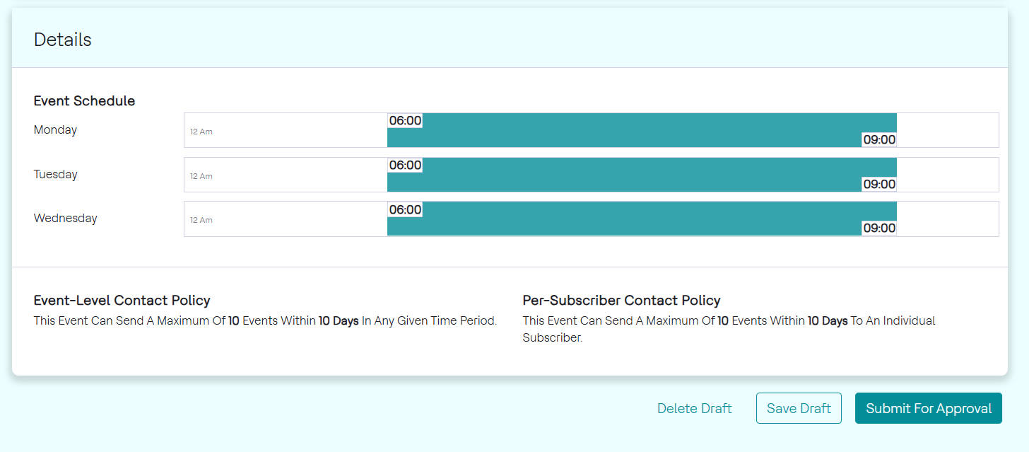 Review the details of the event and specify the dates the event will run. Click Submit for Approval. Once a Checker (or Admin) has reviewed and approved the event, they can select a time period for the duration of the event and deploy it as shown in the image below.