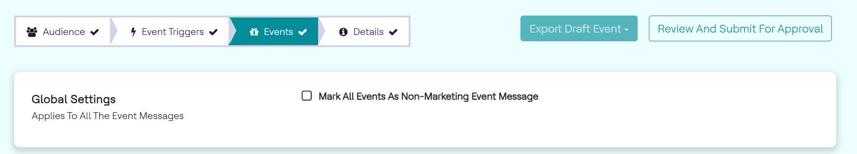 The check-box "Mark all events as a non-marketing event message" disables our default global contact policy check. This default is currently set to limit the outgoing events to 50 in 7 day, per customer, across all events. There is also an event level contact policy that can be configured in the Details tab.