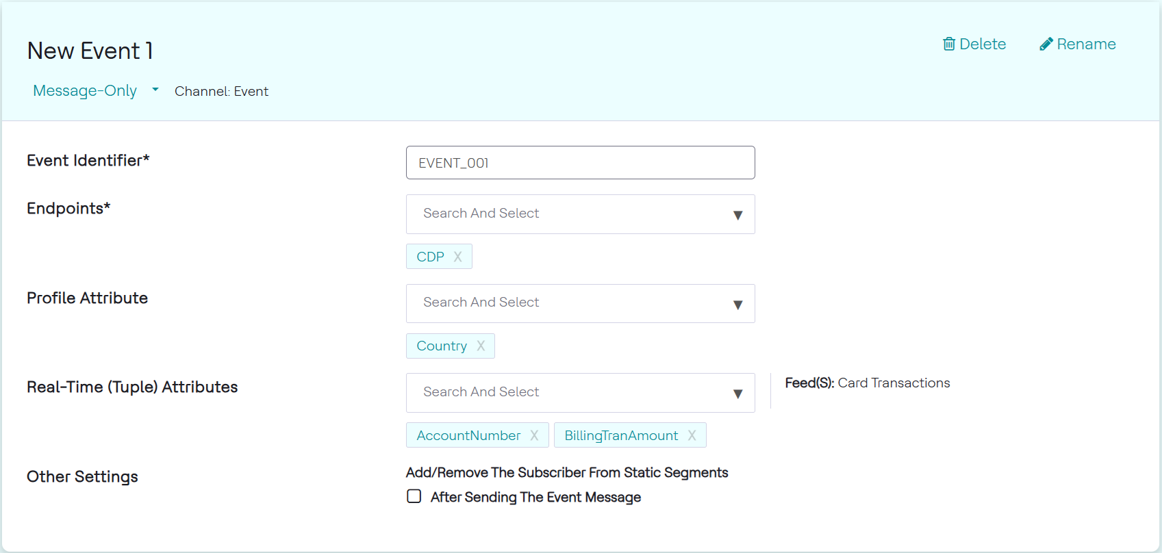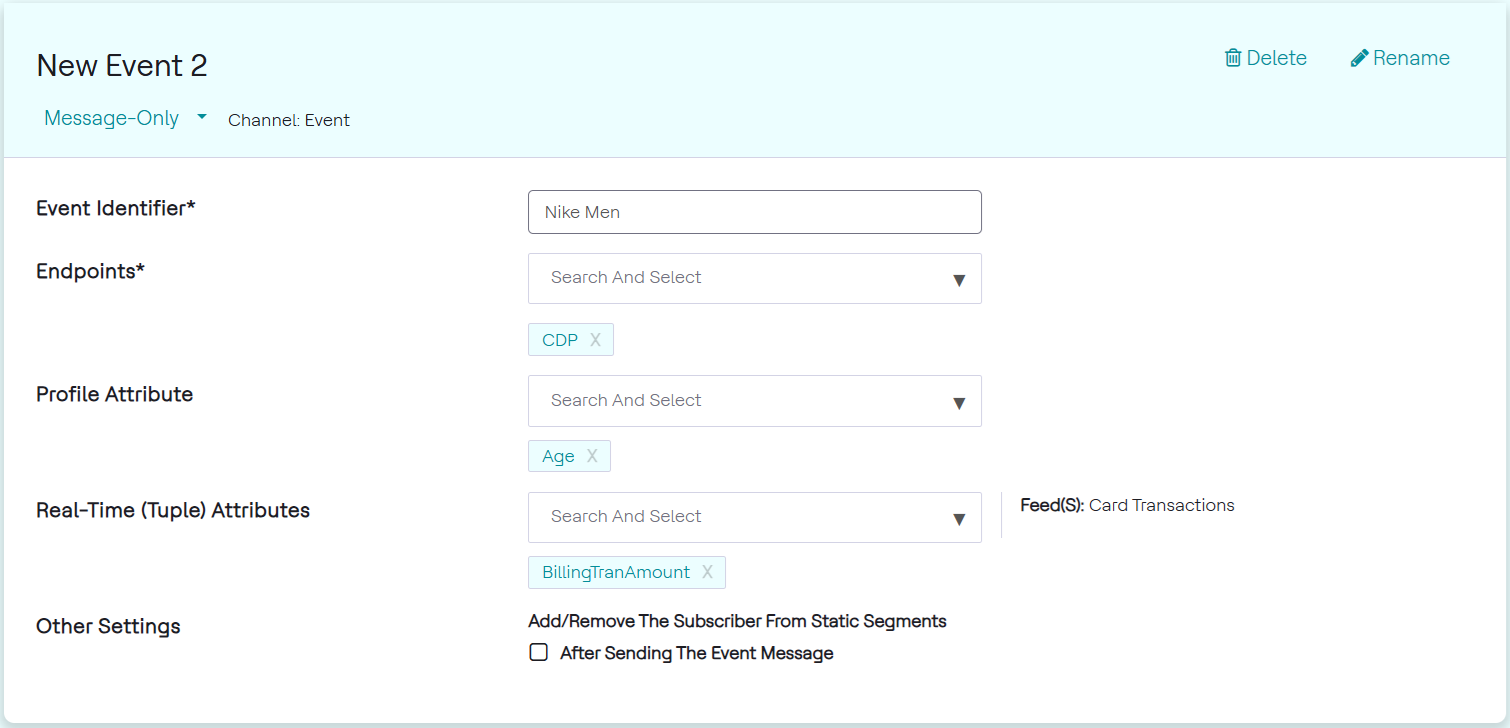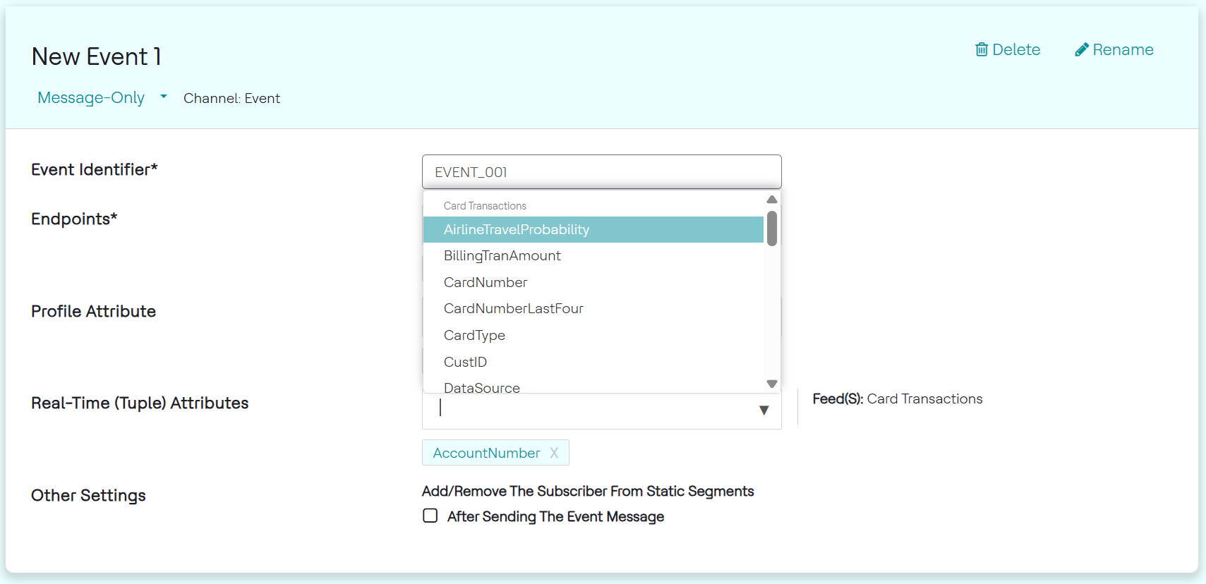 There are two event types to choose from: Message-Only & Action-Based. Both events require an Event ID and Endpoint to be selected. Additionally, the UI allows attributes from each data source to be selected which is forwarded to the chosen endpoint. For all events, we suggest selecting customer first/last name, email ID, phone number, and all relevant channel information (push note, email and text message) with their preference flags from the customer profile with customer ID (custID) and transaction date time (sysDateTime) from real-time attributes.