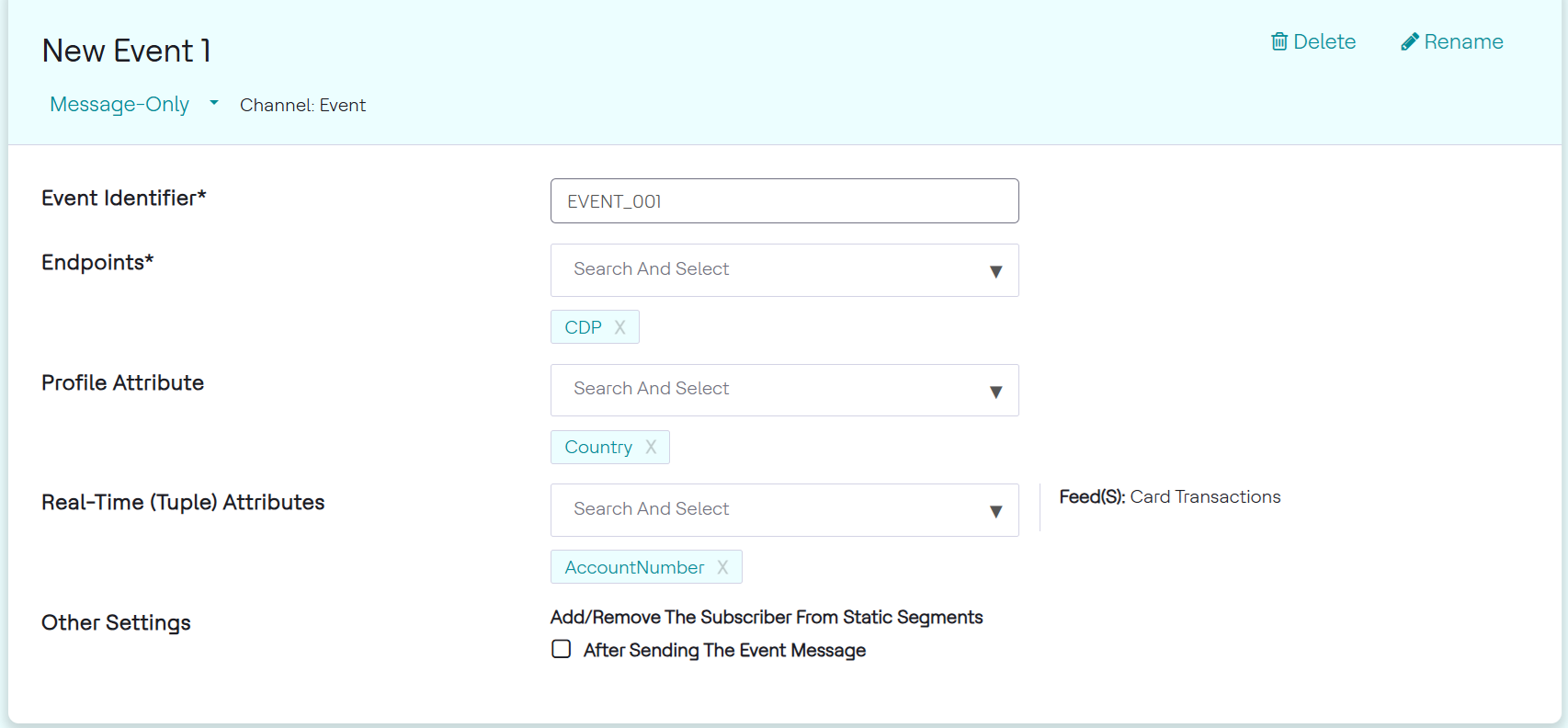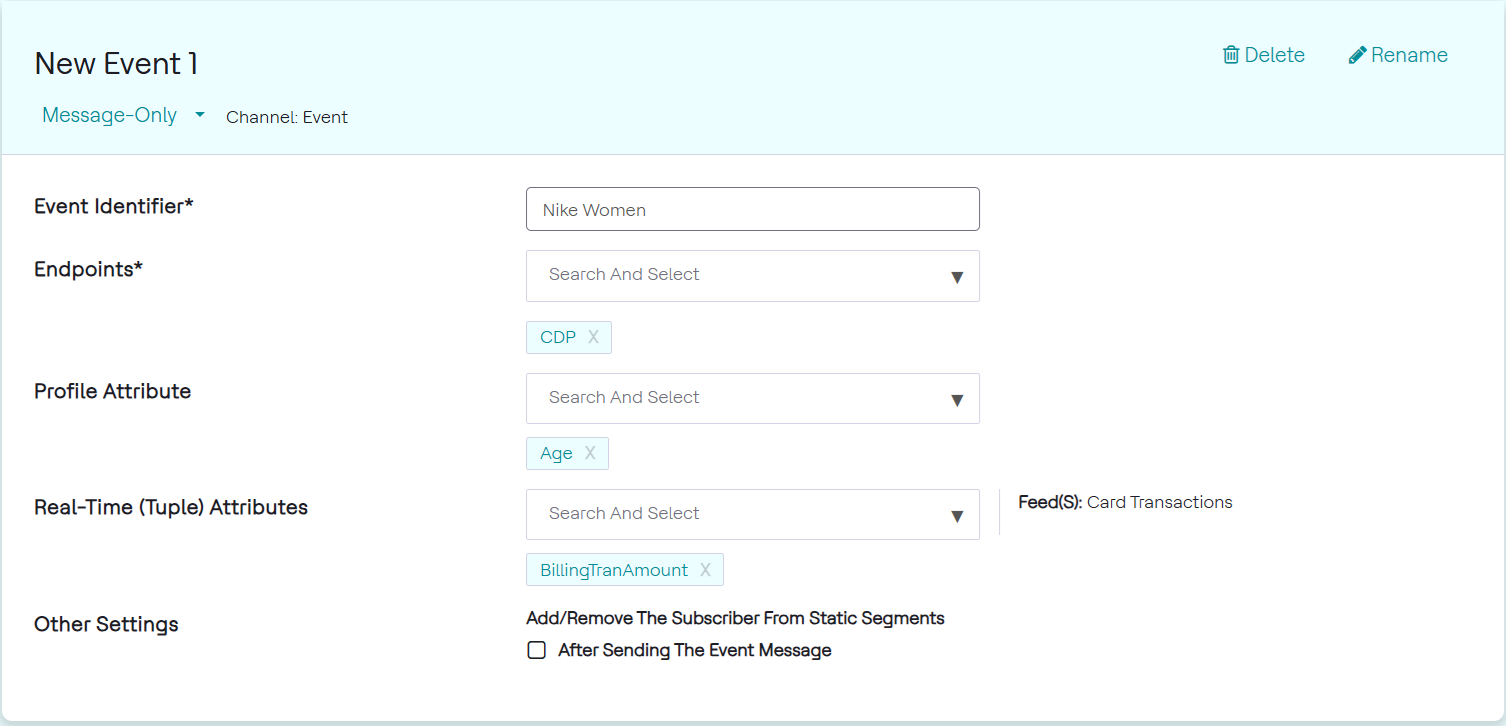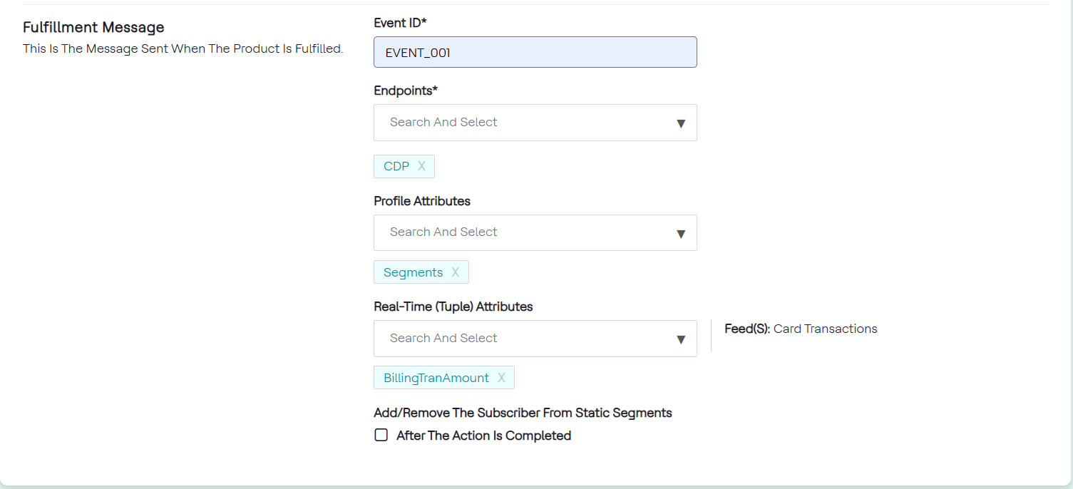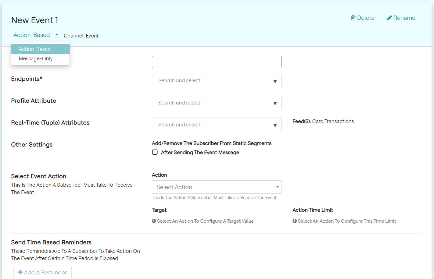 There are two event types to choose from: Message-Only & Action-Based. Both events require an Event ID and Endpoint to be selected. Additionally, the UI allows attributes from each data source to be selected which is forwarded to the chosen endpoint. For all events, we suggest selecting customer first/last name, email ID, phone number, and all relevant channel information (push note, email and text message) with their preference flags from the customer profile with customer ID (custID) and transaction date time (sysDateTime) from real-time attributes.
