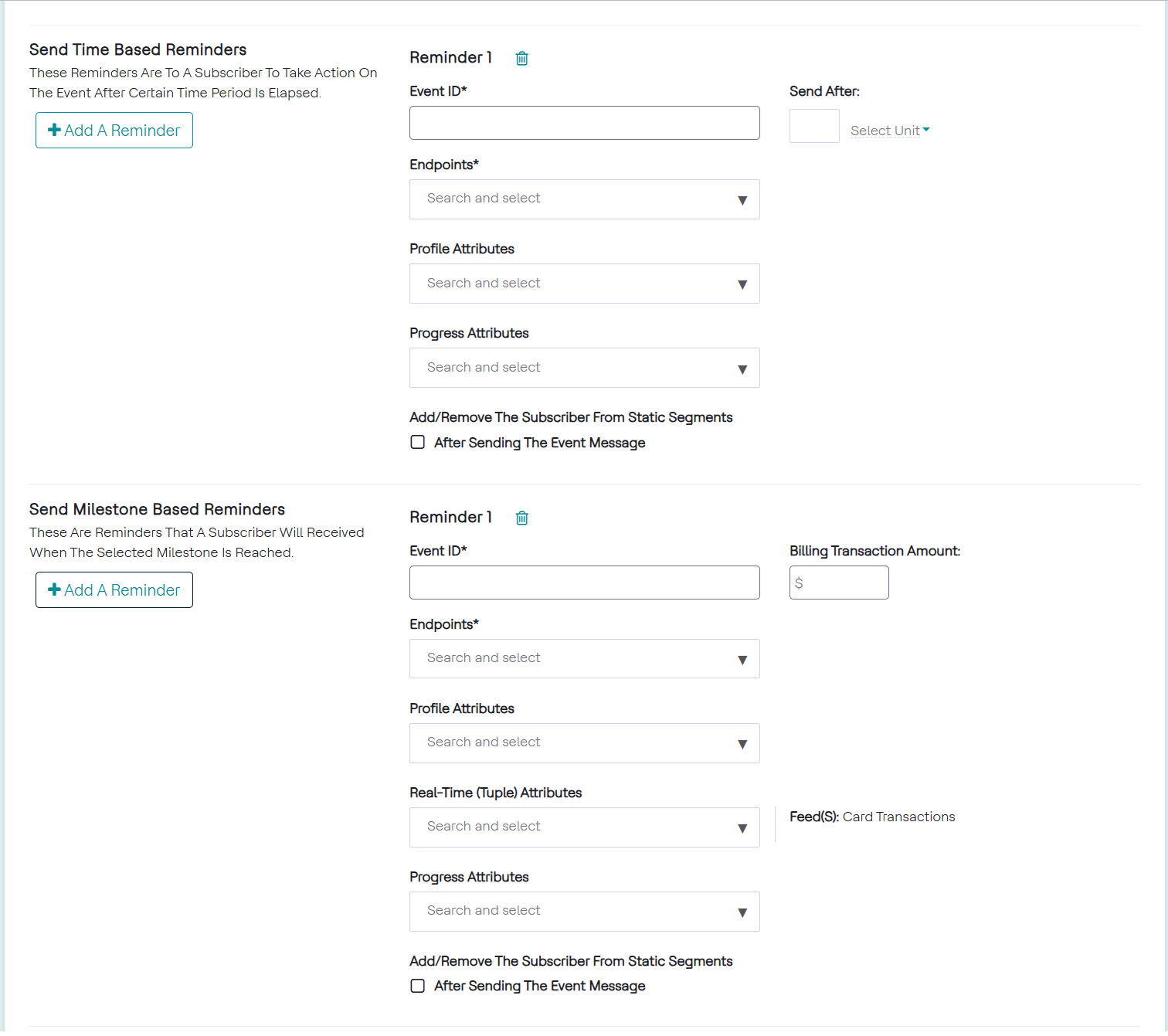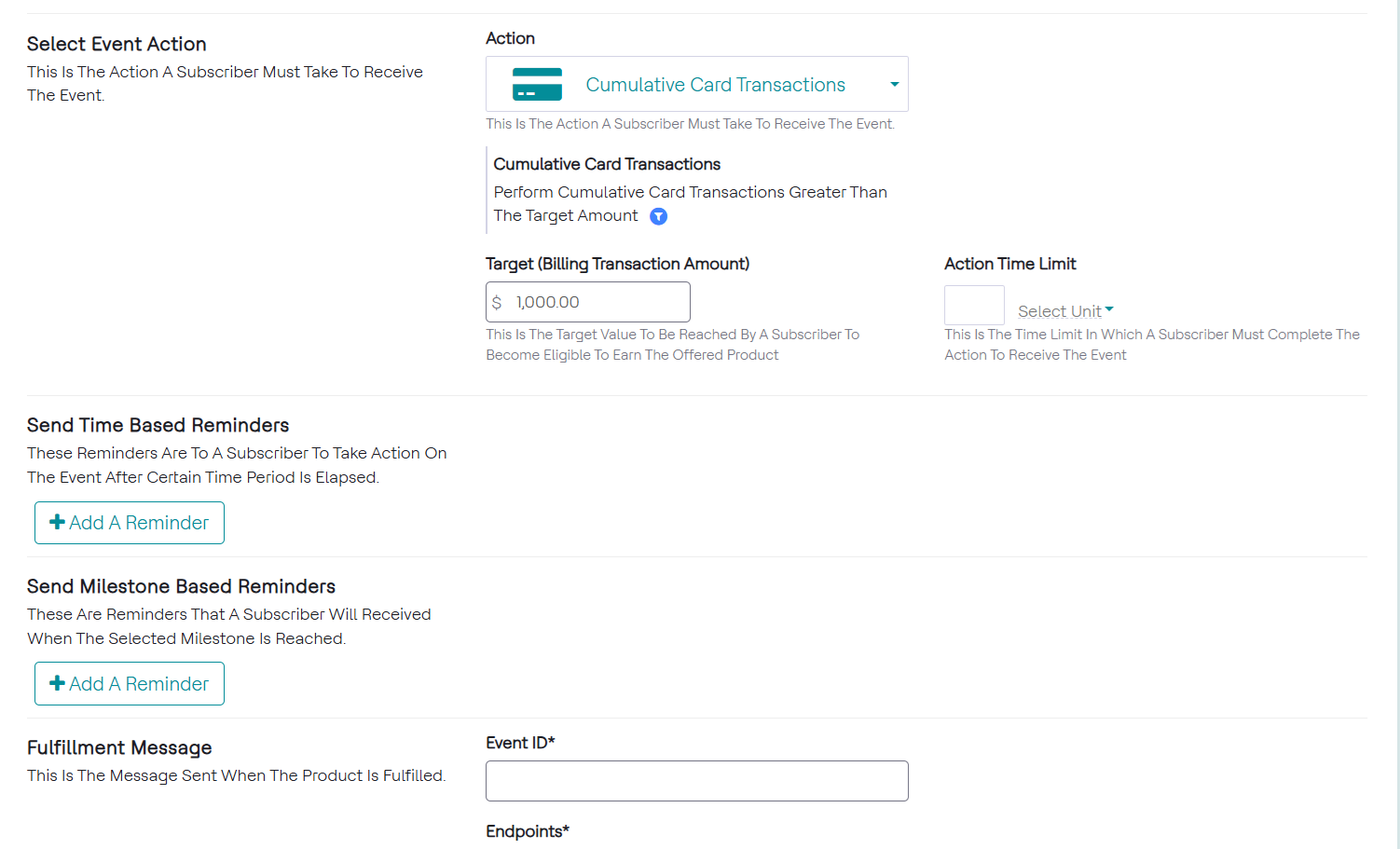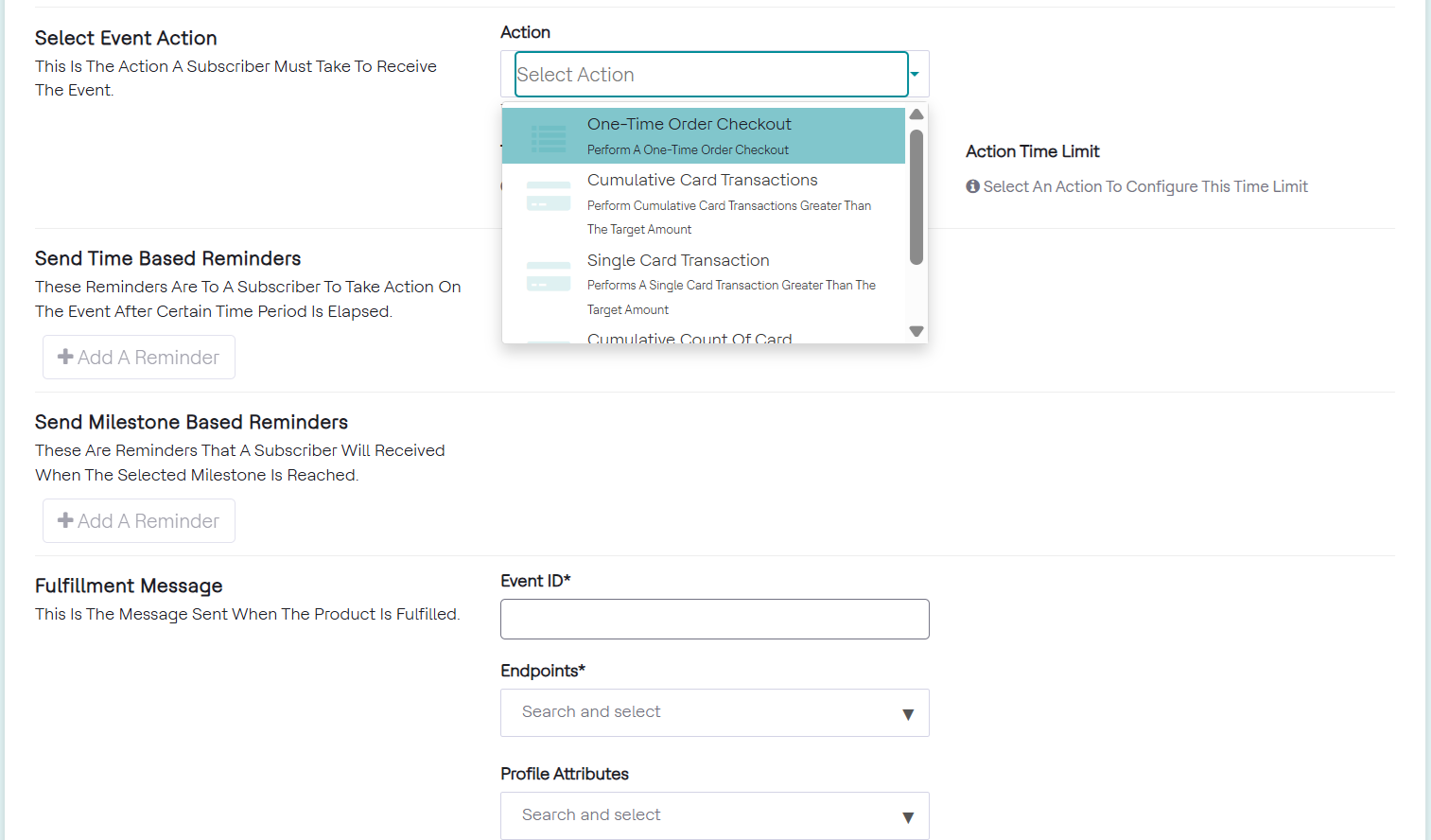 For Action-Based Events, the customer must complete an action to receive the product of an event. Time-based & Milestone-based reminders can be added as well.