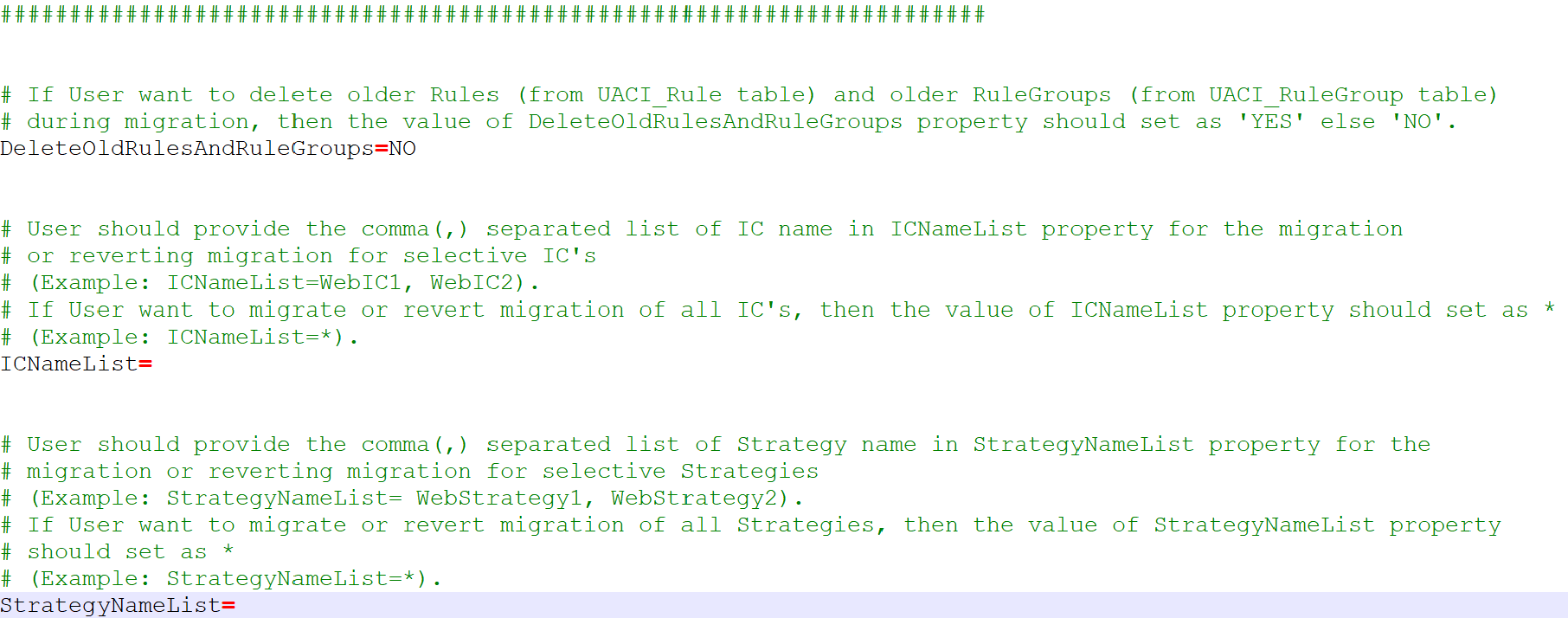 • StrategyNameList: This property specifies the strategies that are migrated or reverted. It must be a comma (,) separated list of strategy names. For example: StrategyNameList= WebStrategy1, WebStrategy2). If all strategies need to be migrated/reverted, use an asterisk (*) as the value: StrategyNameList=*.