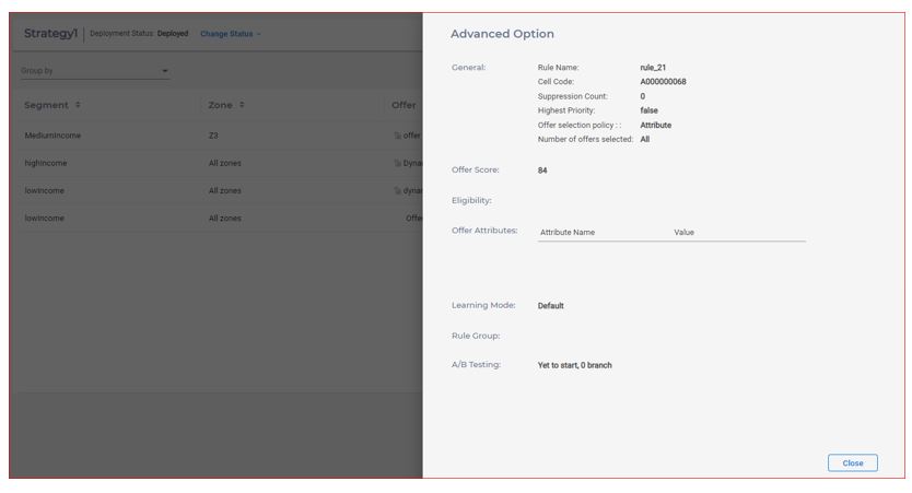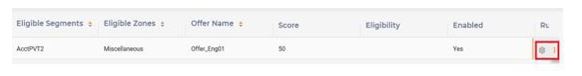 The default column displayed in Rules table are Segment, Zone, Offer, Score and Enabled, where Offer column display either an offer or an offer list assigned to a rule, with an offer list iconAll other properties of a rule on Advanced options can be viewed on a slider by hovering the cursor on the vertical ellipsis to the right of the rule row and then clicking the gear icon.