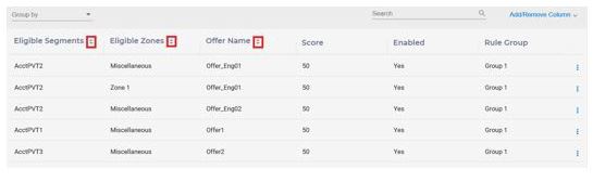 You can also sort Segment, Zone, or Offer column by clicking the up/down arrow provided next to each column header. The effective sorting column and the sorting order is identified by the highlighted arrow