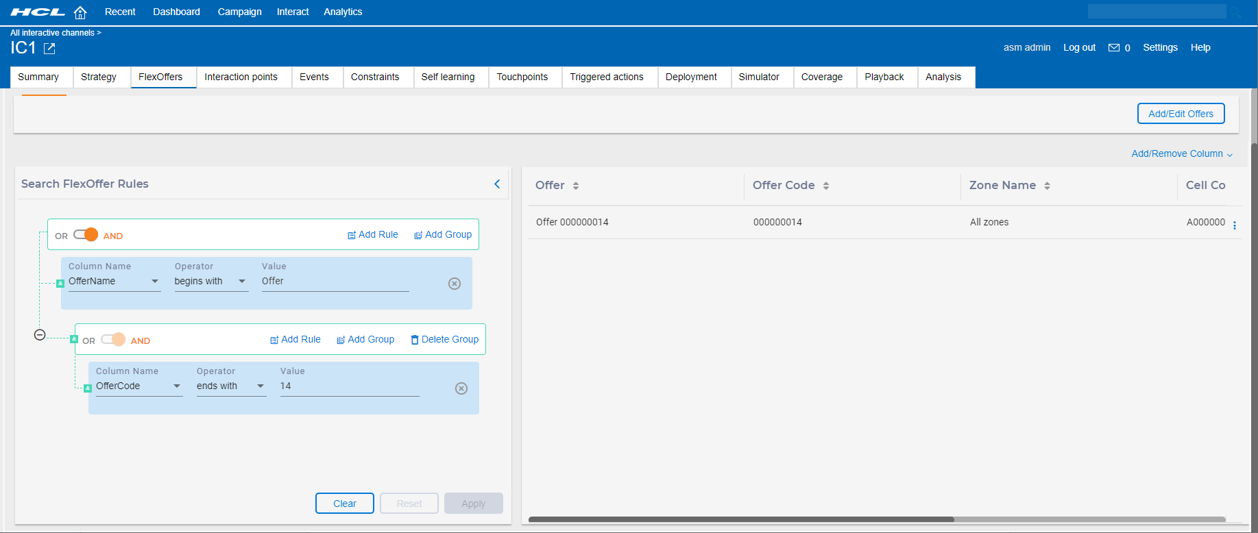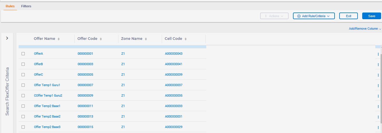 After creating the FlexOffers mapping table, using powerful build in tools you can search the data, edit data, add dynamic columns to the table, and modify advanced settings. In the list of FlexOffers window, select the FlexOffers mapping table that you want to apply FlexOfferRule (table row) or FlexOffers criteria (table column). You can perform the following actions.