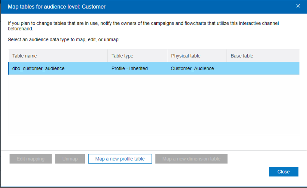 In the Map tables for audience level: Audience-level popup, if table mapping is inherited from the parent interactive channel, then the table type will be suffixed to - Inherited.