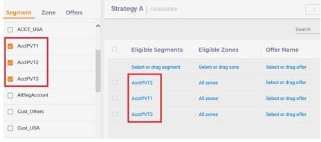 - Drag and drop: In the left pane, select one or multiple segments, zones, offers or offer lists from its tree, drag and drop to its cells to the top row in the New rules pane.