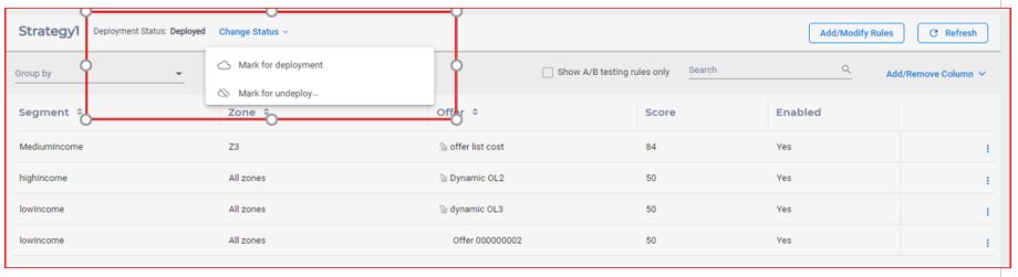 You can mark a strategy for deployment on Strategy tab using Change status dropdown menuWhen the strategy .is marked for deployment, it is added to the list of items that are waiting to be deployed on the interactive channel Deployment tab
