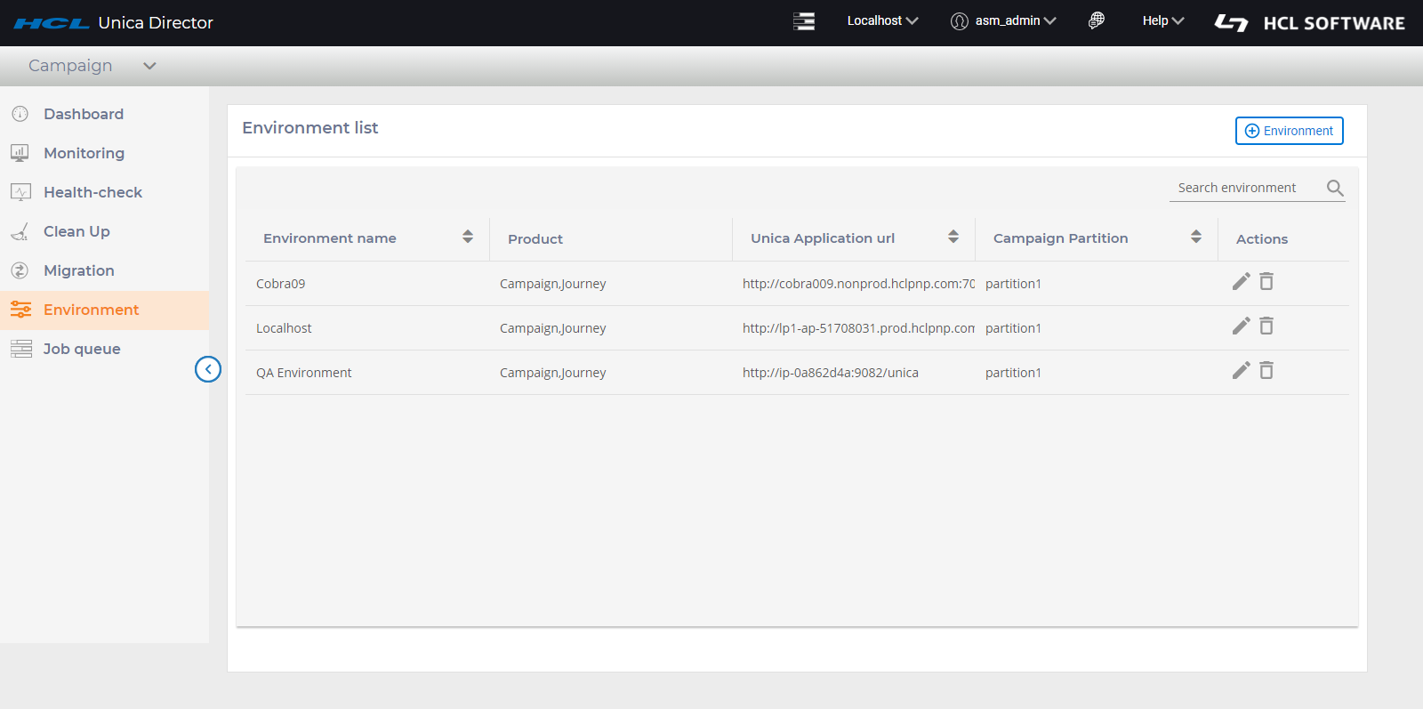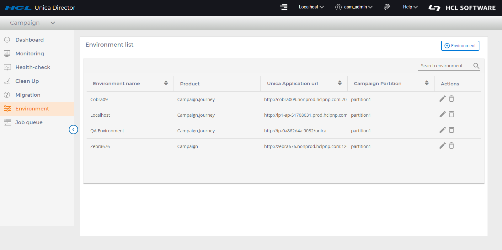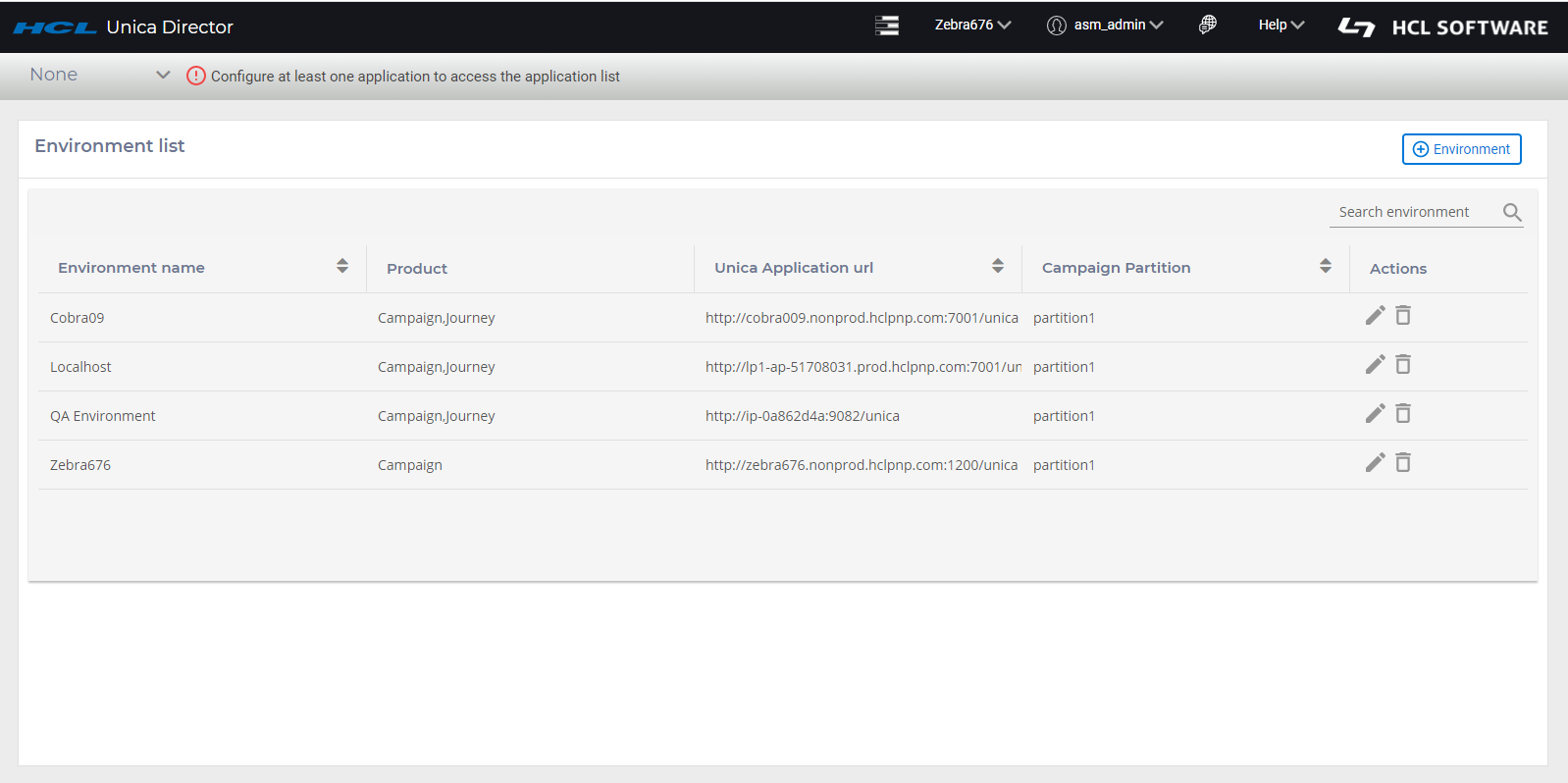 - Sobald die Umgebung hinzugefügt wird, wird sie automatisch als Arbeitsumgebung ausgewählt. Die ausgewählte Umgebung wird in der rechten oberen Ecke angezeigt. Die verschiedenen erforderlichen Aktionen des Unica Director werden in dieser ausgewählten Umgebung durchgeführt.