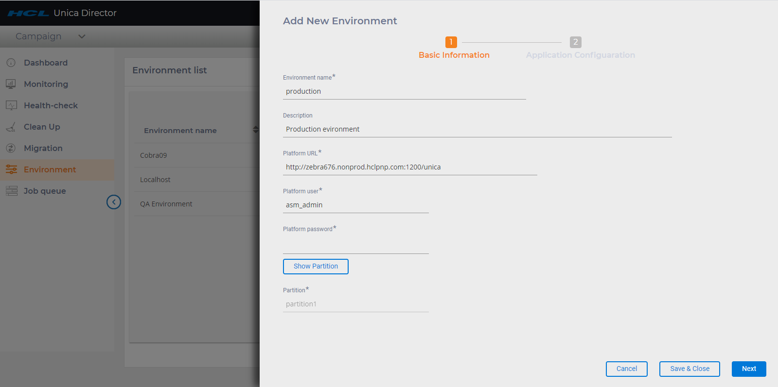 - Klicken Sie auf Speichern und schließen. Die Campaign Anwendung wird konfiguriert.Note: Für jede Partition müssen Sie eine neue Umgebung erstellen.