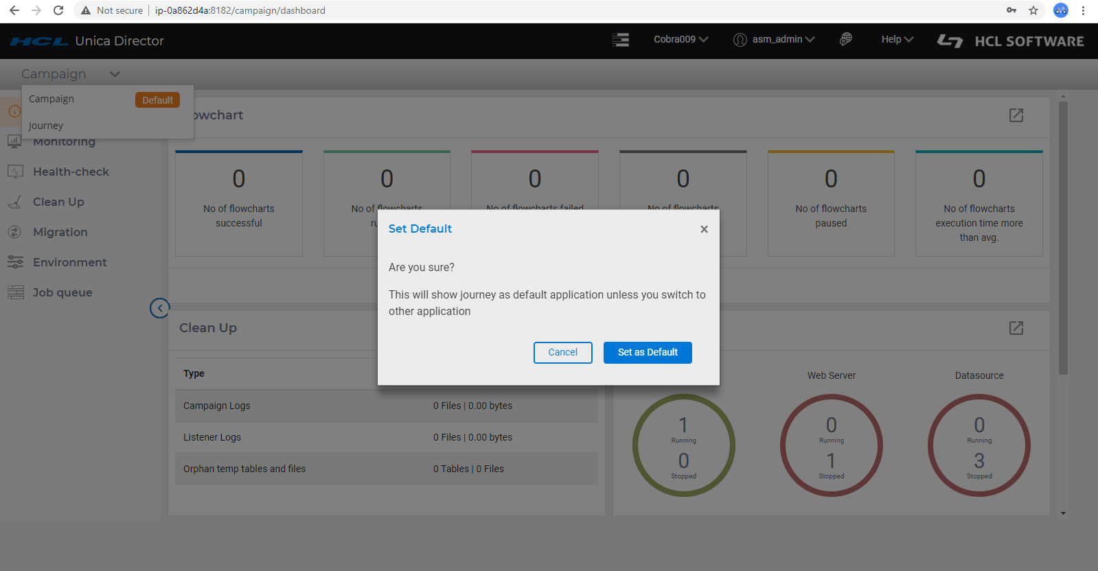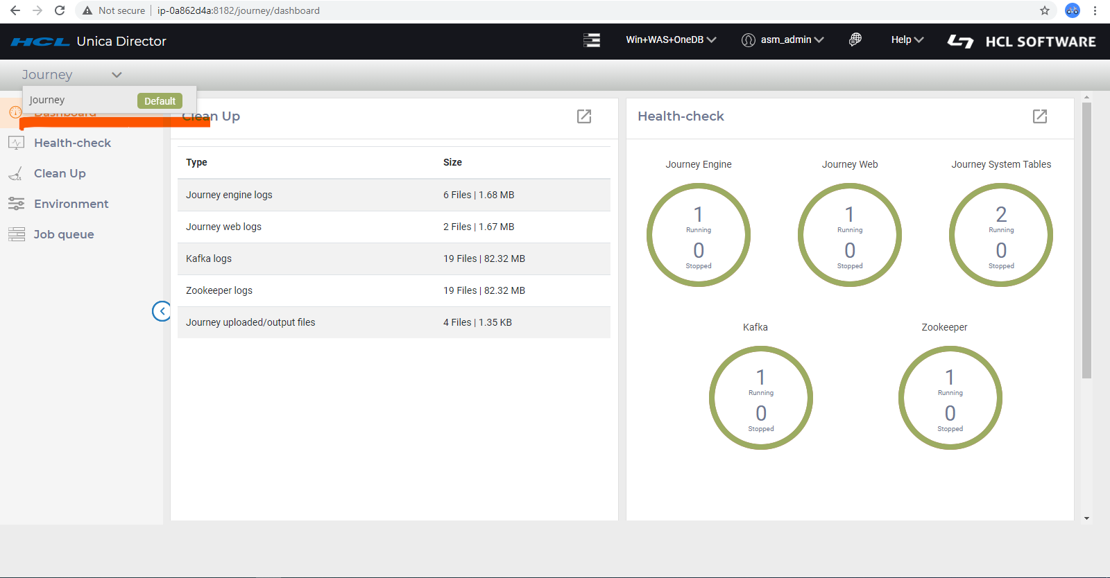 Alle Links im linken Fenster sind Bestandteil von Campaign. Wenn der Benutzer also auf "Gesundheitsprüfung" klickt, werden Details zur Campaign-Prüfung angezeigt und wenn der Benutzer auf Bereinigung klickt, werden die elemente Campaign bereinigt. Um zur Journey-Anwendung zu wechseln, muss der Benutzer auf die Journey klicken und die Standarddashboardseite der Journey wird dargestellt.