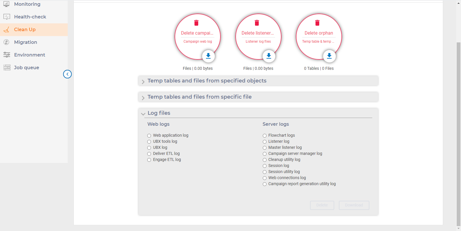 - To download or delete log files, in the Log files section, select the Web logs from Web application log, UBX tools log, UBX log, Unica Deliver ETL log or Engage ETL log.