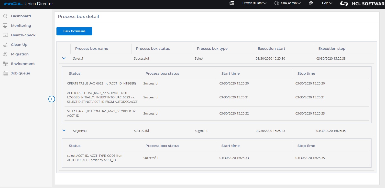 By clicking on flowchart link user will be directed to the flowchart execution details where the process box execution details are available. HCL Unica Director does not show the flowchart information of flowcharts scheduled in the Unica Campaign application. It only shows the flowchart information of the executed flowcharts