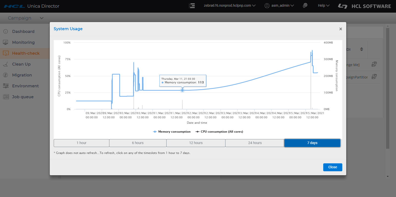 - Le graphique Utilisation de l'UC et Consommation de la mémoire ne s'actualise pas automatiquement. Pour l'actualiser, cliquez sur une plage horaire de 1 heure à 7 jours.