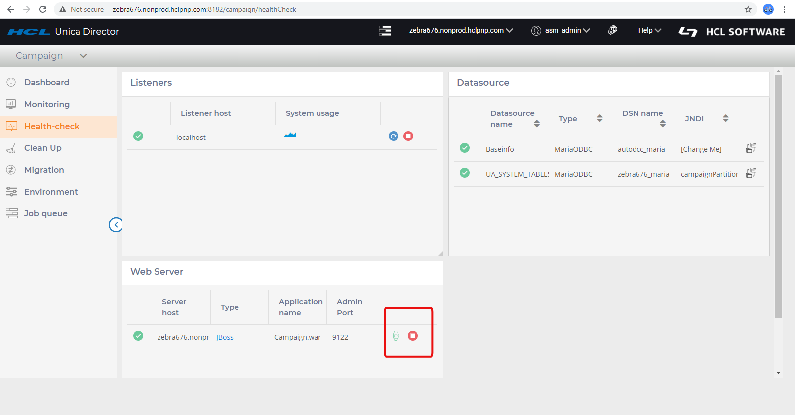 La connectivité de toutes les sources de données configurées dans Platform provenant du serveur d'analyse de Campaign sont testées, et les échecs de connexion affichées doivent apparaître dans les journaux. Vous pouvez obtenir le statut de vos sources de données. Les options Démarrer/Arrêter ne sont pas prises en charge pour les sources de données. Toutes les sources de données sont prises en charge dans ce contrôle de la connectivité.