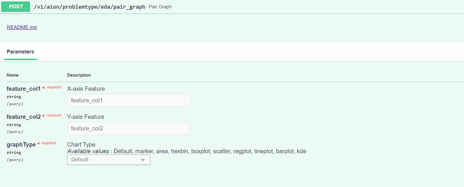feature_col1 Mandatory Feature assigned to the X-axis feature_col2 Mandatory Feature assigned to the Y-axis graphType Mandatory Available values are: - Default