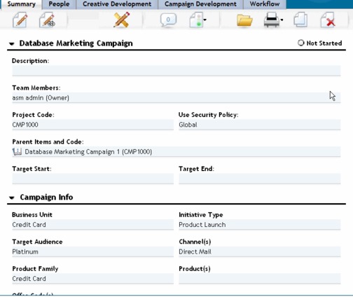 The fields in the top portion of the tab (the Database Marketing Campaign section) are standard attributes. When creating the object, users enter this information on the template's Properties tab.