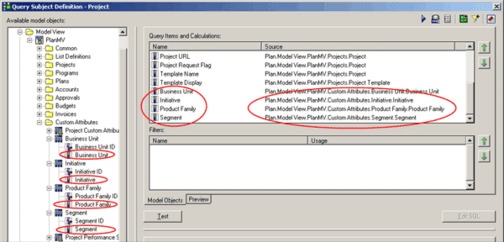 The Query Subject definition for Project was updated with query items for the custom attributes, as shown here.