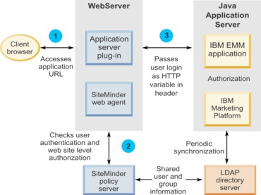 The following figure illustrates how IBM EMM works with SiteMinder and an LDAP directory server to authenticate and authorize users.