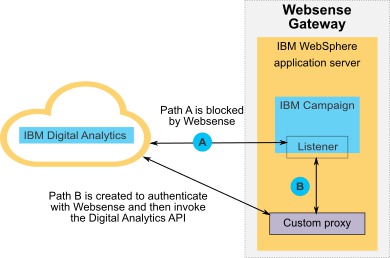 The custom proxy is a Java servlet implementation that acts as a forward proxy. It is injected between the Unica Campaign listener and Digital Analytics. The custom proxy acts as an end point for the Unica Campaign listener to invoke Digital Analytics APIs. Internally, the custom proxy authenticates itself with the Websense content gateway and then securely invokes the APIs outside the network.