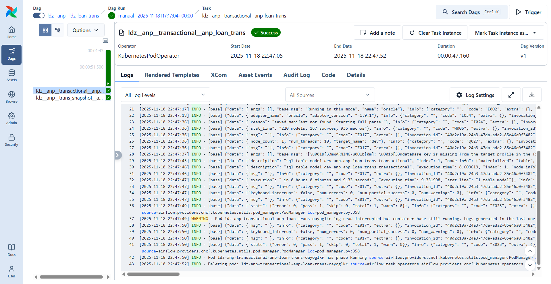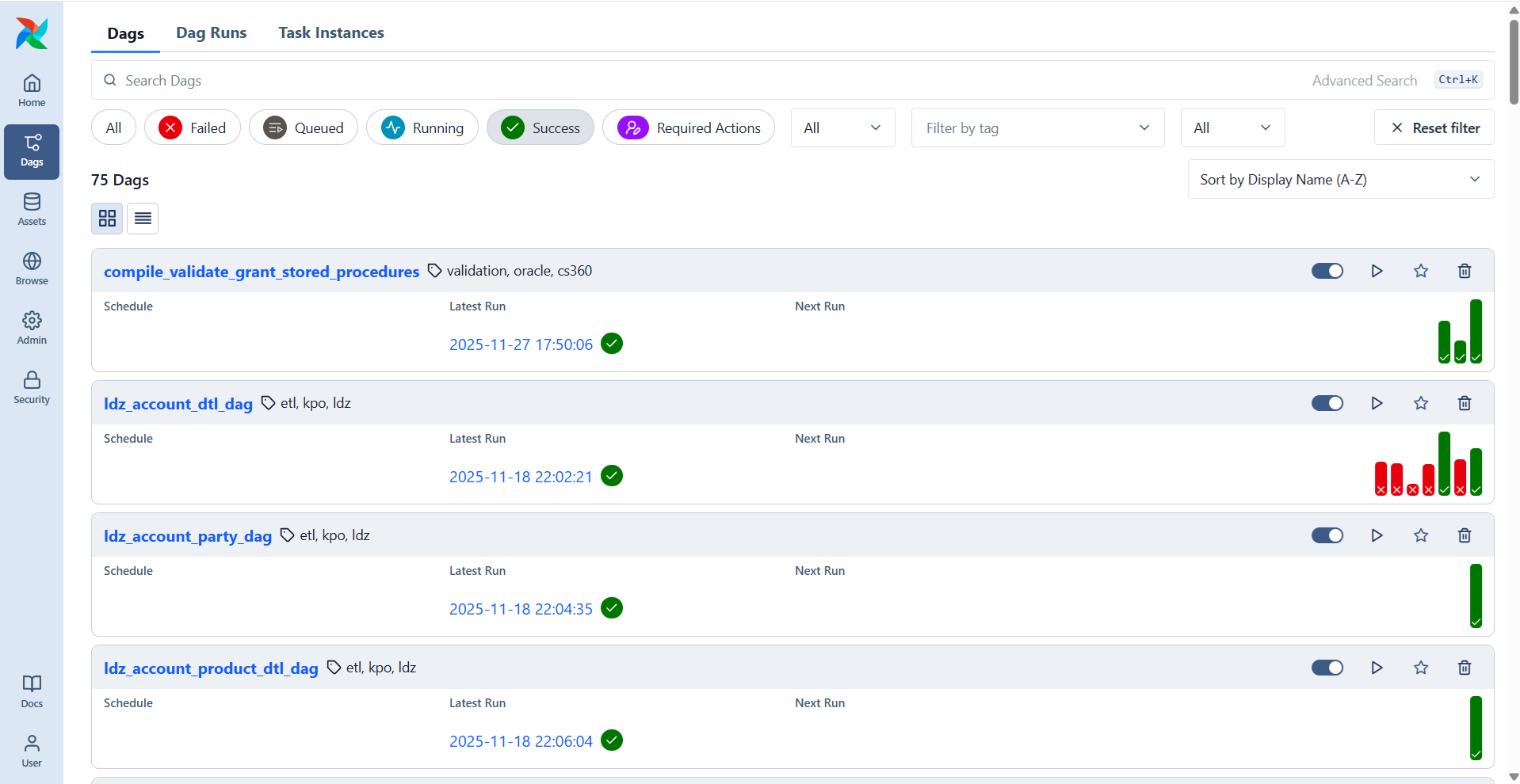 These DAGs will execute as they are scheduled (or ad-hoc runs as needed) and their execution logs will be visible in the front-end by navigating below path: