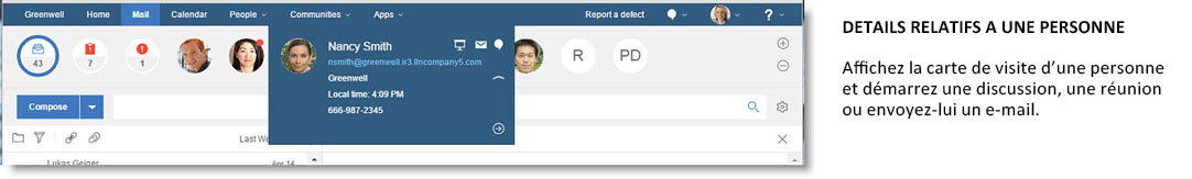 Vous pouvez consulter la carte de visite d'un contact de différentes façons. Survolez avec la souris un nom dans la liste des messages jusqu'à faire apparaître la mention Afficher la carte de visite. Cliquez sur le nom concerné, la carte de visite s'affiche. Vous pouvez aussi ouvrir la carte de visite d'un contact en cliquant sur son nom dans la vue des messages (destinataires) ou depuis la photo de la personne dans la barre Favoris. Dans ce dernier cas, survolez la photo avec le pointeur de votre souris puis cliquez sur l'icône Informations. Enfin, lorsque les résultats de la recherche s'affichent lorsque vous entrez le nom d'un destinataire dans un nouveau message, vous pouvez cliquer sur l'icône d'information en regard du nom de toute personne figurant des ces résultats pour afficher leur carte de visite.