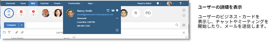 連絡先のビジネス・カードを表示するにはいくつかの方法があります。メッセージ・リスト内の名前にカーソルを置き、しばらくするとビジネス・カードのヒントが表示されます。ポイントする名前をクリックすると、ビジネス・カードが表示されます。メッセージ・ビュー (受信者) 内の名前をクリックするか、お気に入りバーのユーザーの写真から、連絡先のビジネス・カードを開くこともできます。写真では、ユーザーの写真の上にマウス・カーソルを置き、情報アイコンをクリックするとビジネス・カードが表示されます。最後に、新規メッセージに受信者名を入力すると検索結果が表示されます。検索結果内の任意のユーザーの名前の隣にある情報アイコンをクリックするとビジネスカードが表示されます。