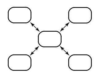 In the hub patterns (Figure 1 and Figure 2), the hub replicas exchange packets with all spoke replicas. In the tree pattern (Figure 3), the root replicas exchange packets with branch replicas.