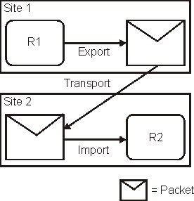Information is exported from a replica in packets. A logical packet includes all the information required to create a new replica (replica-creation packet) or to update one or more existing replicas (update packet). For flexibility, and to accommodate limitations of data-transport facilities, each logical packet can be created as a set of physical packets.