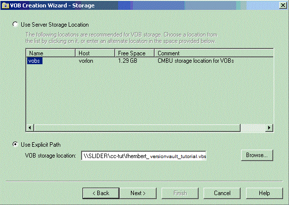 - Navigate to the shared cc-tut tutorial folder and double-click it. Notice HCL VersionVault completed the name of the VOB storage directory: your-username_versionvault_tutorial.vbs.