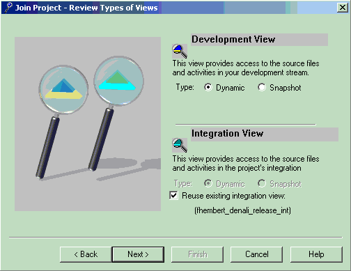 The third page of the Join Project Wizard prompts you to specify the type of view you want to use for the development and integration streams. Views are the mechanism by which you get access to the project's sources.