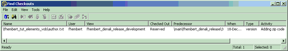 If any checkouts are found, the Find Checkouts dialog box identifies the following (from left to right):
